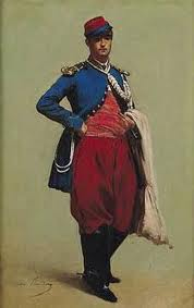 In June 1861, Claude Monet (1840-1926), later one of the greatest of the French impressionists, was studying art in Paris when he was drafted for a seven year hitch. Normally a young middle-class man could avoid military service by paying commutation or supplying a substitute. Monet was, however, on the outs with his family over a number of issues, including his desire to study art. Although his father offered to pay the fr 2,500 commutation fee, it was on condition that the young man return home, which he rejected. Moreover, according to Monet, “The seven years of service that appalled [the family] were full of attraction for me,” going on to add, “Nothing seemed more attractive than the endless trekking under the sun, the sabers rattling, the nights spent under canvas in the desert . . . .” As a willing conscript, Monet was able to secure assignment to the elite 1er régiment des chasseurs d'Afrique –the 1st African Light Cavalry, stationed in Algeria.