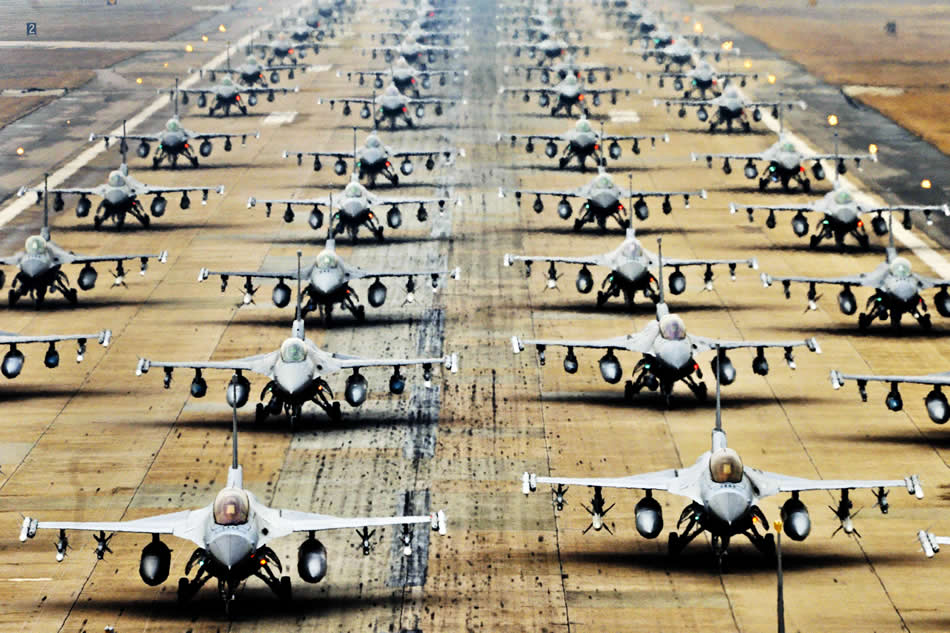 F-16 Fighting Falcons demonstrate an "Elephant Walk" as they taxi down a runway during an exercise on Kunsan Air Base, South Korea, March 2, 2012. The air crews are assigned to the 35th and 80th Fighter Squadrons, the 8th Fighter Wing, Kunsan Air Base; the 421st Expeditionary Fighter Squadron, 388th Fighter Wing, Hill Air Force Base, Utah; the 55th Expeditionary Fighter Squadron, the 20th Fighter Wing, Shaw Air Force Base, S.C.; and the 38th Fighter Group of the South Korean Air Force. U.S. Air Force photo by Senior Airman Brittany Auld