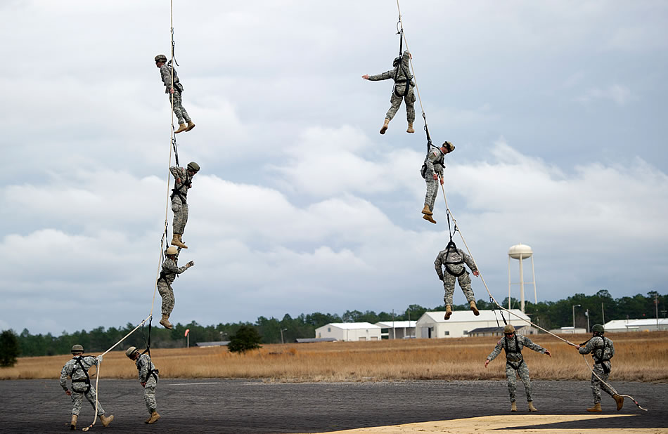 Soldiers from 7th Special Forces Group (Airborne) (7 SFG (A)) begin to be lifted off the ground by a CH-47 Chinook helicopter during a training event Eglin Base Air Force Base, Fl., Feb. 05, 2013. Green Berets from 7SFG (A) participated in a training event in which they practiced Special Purpose Insertion Extraction (SPIE). Spies are used to rapidly insert or extract Soldiers from terrain that does not allow helicopters to land. (U.S. Army photo by Spc. Steven Young)