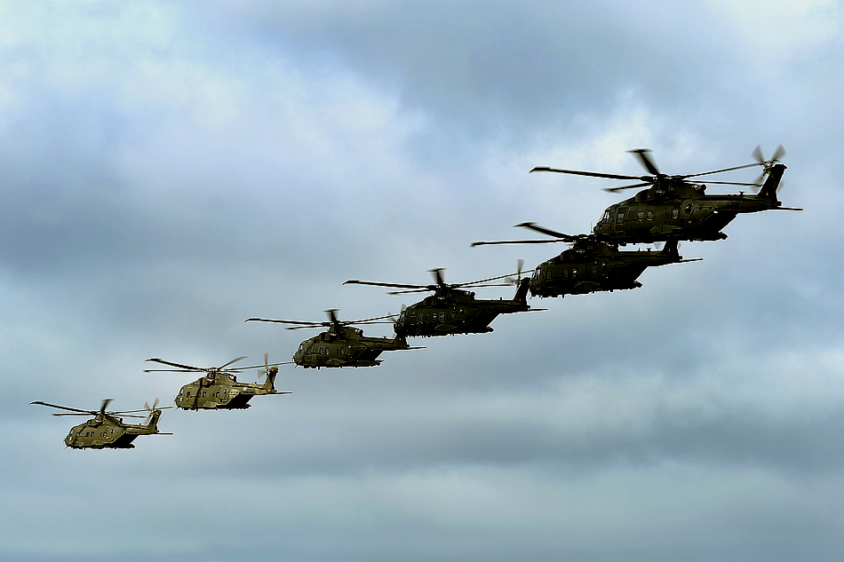 3/26/2015 - Merlin helicopters from 846 Naval Air Squadron fly in formation from Royal Air Force Base Benson to Royal Naval Air Station Yeovilton. (Royal Navy Photo by LA(Phot) Dan Rosenbaum)