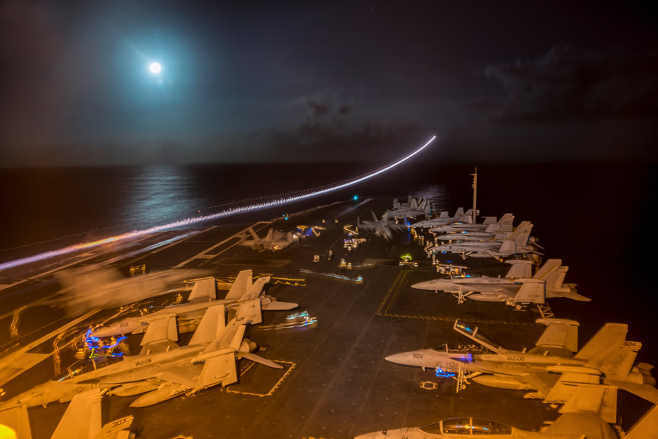 PACIFIC OCEAN (Jan. 14, 2017) An F/A-18F Super Hornet assigned to Strike Fighter Squadron (VFA) 2 launches from the flight deck of the aircraft carrier USS Carl Vinson (CVN 70). The Carl Vinson Carrier Strike Group will report to U.S. 3rd Fleet, headquartered in San Diego, while deployed to the western Pacific as part of the U.S. Pacific Fleet-led initiative to extend the command and control functions of 3rd Fleet into the region. (U.S. Navy Photo by Mass Communication Specialist 2nd Class Sean M. Castellano)