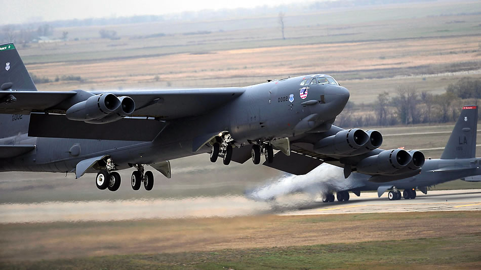 A B-52H Stratofortress assigned to Air Force Global Strike Command (AFGSC) takes off from the flightline at Minot Air Force Base, N.D., Oct. 30, 2016, during exercise Global Thunder 17. AFGSC supports U.S. Strategic Command's (USSTRATCOM) global strike and nuclear deterrence missions by providing strategic assets, including bombers like the B-52 and B-2, to ensure a safe, secure, effective and ready deterrent force. Global Thunder is an annual training event that assesses command and control functionality in all USSTRATCOM mission areas and affords component commands a venue to evaluate their joint operational readiness. (U.S. Air Force photo by Tech. Sgt. Evelyn Chavez)