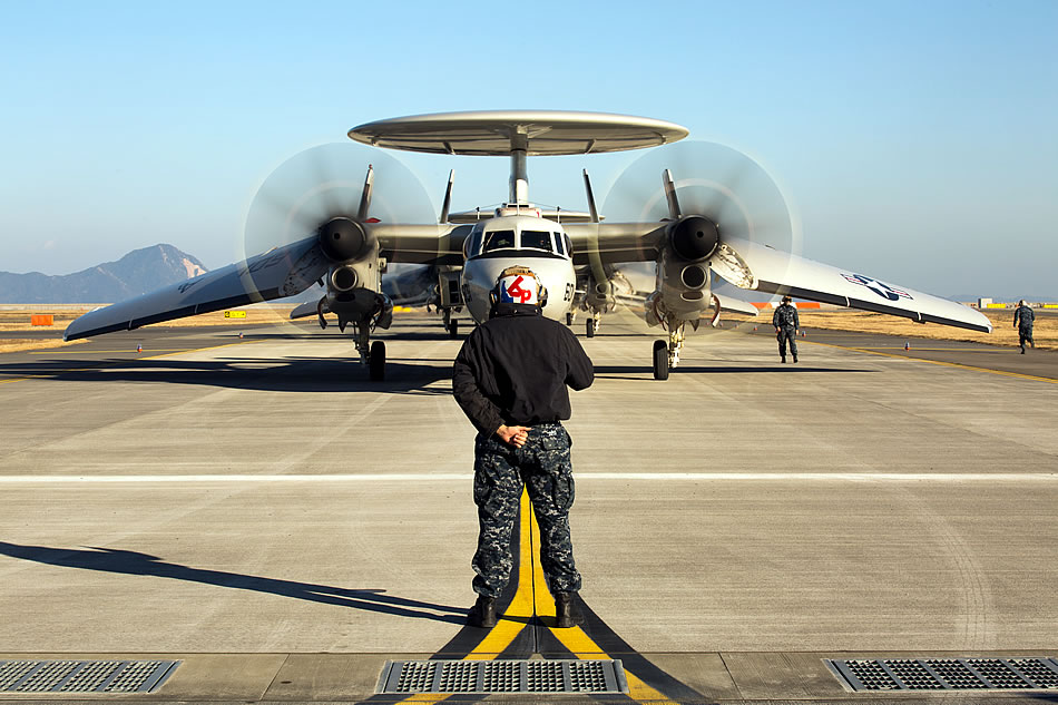 IWAKUNI, Japan (Feb. 2, 2017) Five E-2D Advanced Hawkeyes assigned to Carrier Airborne Early Warning Squadron (VAW) 125 land onboard Marine Corps Air Station Iwakuni, Japan. The E-2D is equipped with the most advanced airborne radar in the world, possessing systems which increase the capabilities to defend Japan and provide security in the Indo-Asia-Pacific region. (U.S. Marine Corps photo by Lance Cpl. Jacob A. Farbo)