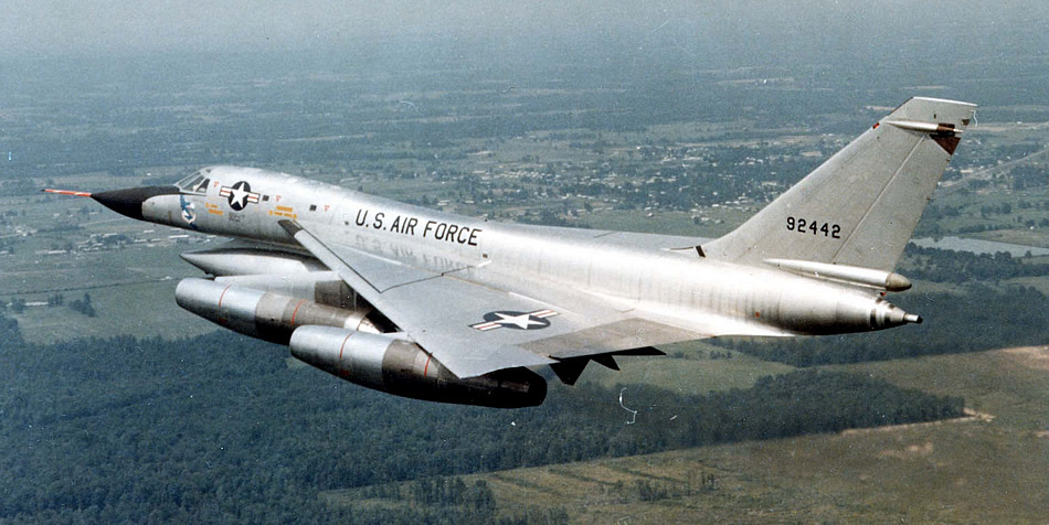 Convair B-58A Hustler in flight. The photo was taken on June 29, 1967. The Hustler was the first operational bomber that could fly at Mach 2. The Convair had a short operational life being only active from 1960 - 1970 and was never used in combat to drop conventional munitions. The Soviet Union developed the high altitude SA-2 missile which would have forced the B-57 into using low altitude tactics which it was ill-equipped to perform. A great looking aircraft with limited use. (U.S. Air Force photo)