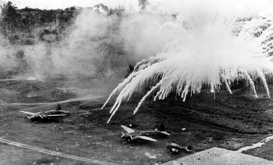 The result of phosphorus bombs and how they worked on a Betty and a Zeke on Lakunai Field during the attack at Rabaul. (U.S. Air Force photo)