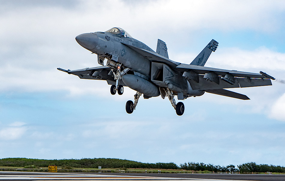 IWO TO, Japan (May 8, 2017) An F/A-18F Super Hornet assigned to the "Dambusters" of Strike Fighter Squadron (VFA) 195 practices a touch-and-go landing during field carrier landing practice qualifications in Iwo To, Japan. VFA-195 is part of Carrier Air Wing (CVW) 5, providing a combat-ready force that protects and defends the collective maritime interest of the U.S. and its allies and partners in the Indo-Asia-Pacific region. (U.S. Navy photo by Mass Communication Specialist 3rd Class Matthew C. Duncker)