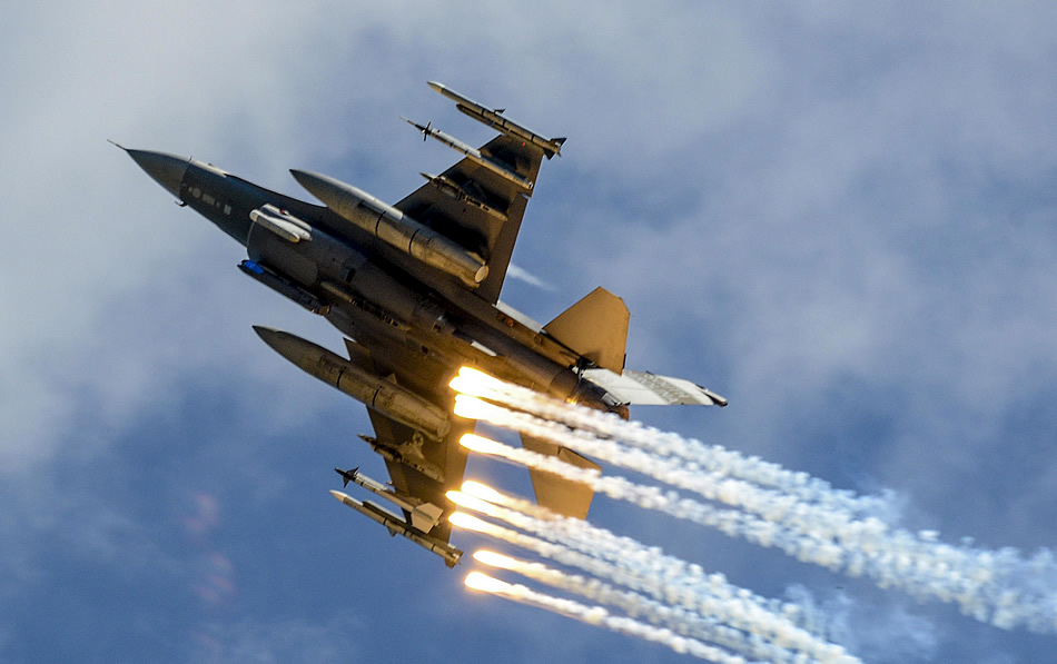 A U.S. Air Force F-16 Fighting Falcon assigned to the 169th Fighter Wing deploys flares over McEntire Joint National Guard Base, South Carolina, May 6, 2017 during the South Carolina National Guard Air and Ground Expo. This expo is a combined arms demonstration showcasing the abilities of South Carolina National Guard Airmen and Soldiers while saying thank you for the support of fellow South Carolinians and the surrounding community. (U.S. Air National Guard photo/Tech. Sgt. Jorge Intriago)