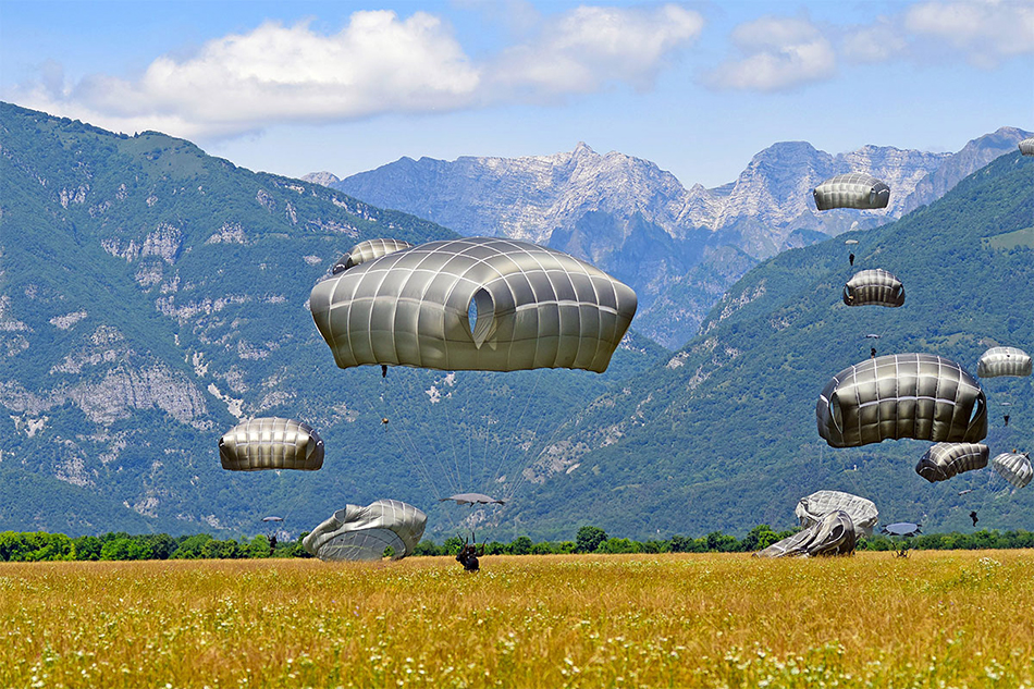 U.S. Army Paratroopers assigned to 173rd Airborne Brigade, descend onto Juliet Drop Zone in Pordenone, Italy, June 8, 2017, after exiting a U.S. Air Force 86th Air Wing C-130 Hercules aircraft during airborne operations. The 173rd Airborne Brigade is the U.S. Army Contingency Response Force in Europe, capable of projective forces anywhere in the U.S. European, Africa or Central Command areas of responsibility within 18 hours. (U.S. Army Photos by Visual Information Specialist Davide Dalla Massara)