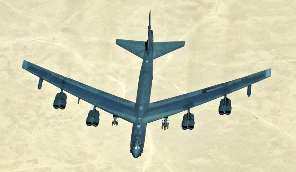 A B-52 Stratofortress waits to approach a 908th Expeditionary Air Refueling Squadron KC-10 Extender for refueling, Aug. 8, 2017. In a conventional conflict, the B-52 can perform strategic attack, close-air support, air interdiction, offensive counter-air and maritime operations. (U.S. Air Force photo/Staff Sgt. Marjorie A. Bowlden)