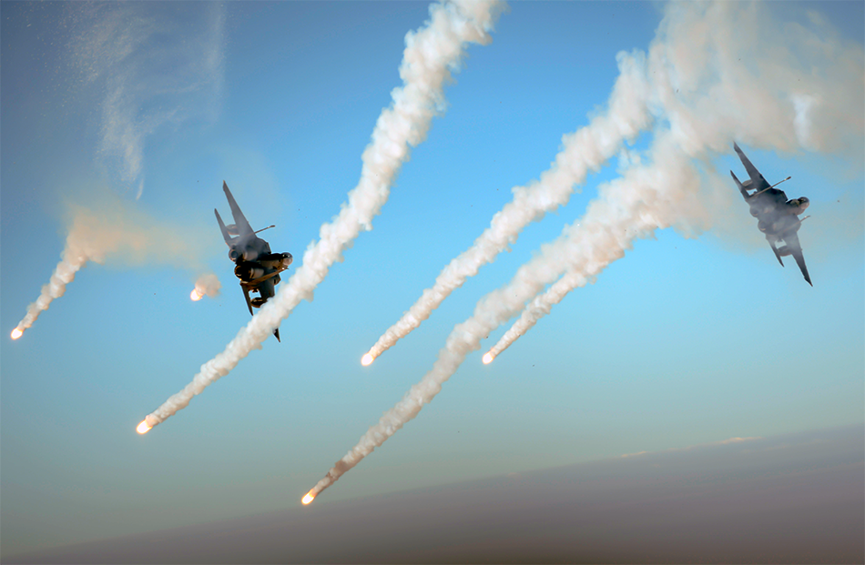 Two F-15E Strike Eagles fire flares over Iraq during a mission in support of Operation Inherent Resolve Sept. 6, 2017. The Strike Eagle is a dual-role fighter designed to perform air-to-air and air-to-ground missions. An array of avionics and electronics systems give the F-15E the capability to fight at low altitude, day or night, and in all weather conditions. (U.S. Air Force photo by Staff Sgt. Trevor T. McBride)
