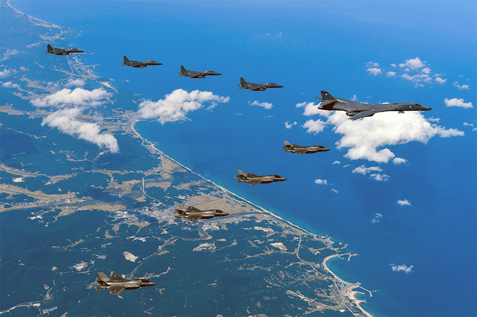 U.S. Air Force and Marine Corps aircraft conduct a mission with the South Korean air force over the Korean Peninsula, Sept. 18, 2017. The bilateral forces conducted the mission in response to North Korea's intermediate-range ballistic missile launch Sept. 14. Army photo by Staff Sgt. Steven Schneider