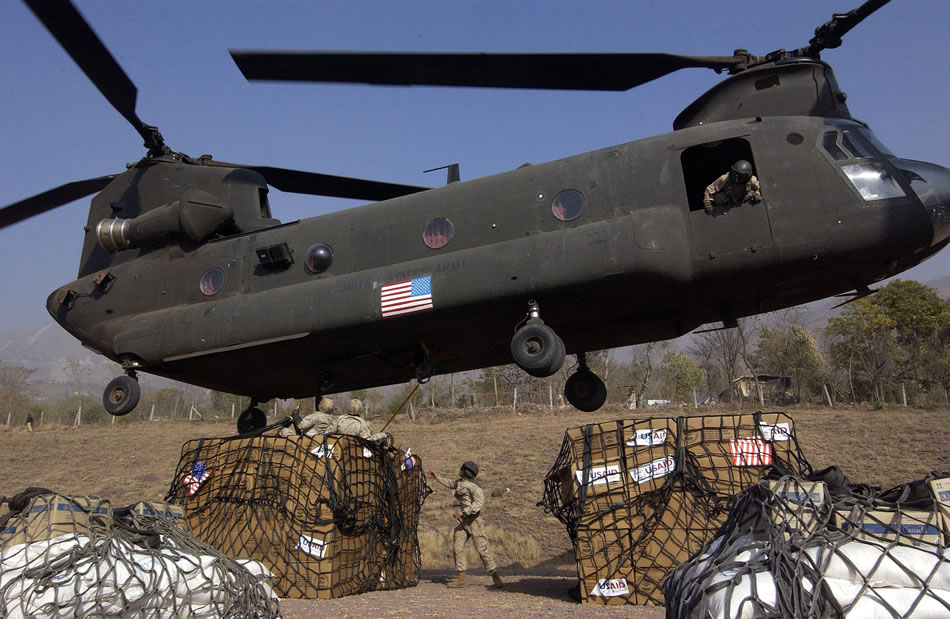 12/17/05 - U.S. service members externally load humanitarian relief supplies onto a CH-47D Chinook helicopter at Muzaffarabad, Pakistan, Dec. 17, 2005. The U.S.military is participating in humanitarian assistance operations in support of Pakistani-led relief efforts to bring aid to victims of the devastating earthquake that struck the region October 8, 2005. (U.S. Air Force photo by Airman 1st Class Barry Loo)