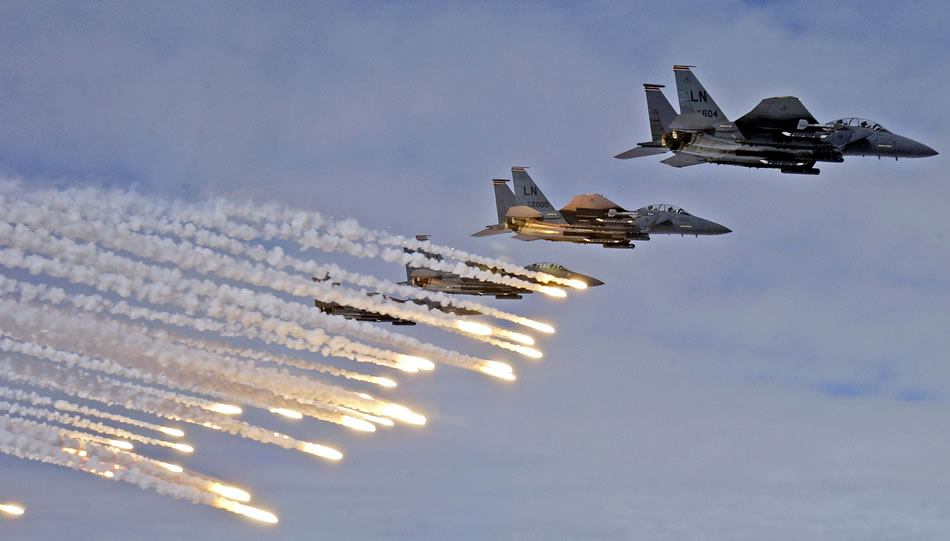 SUFFOLK, England -- F-15E Strike Eagles launch chaff and flares while flying toward the Royal Air Force Holbeach bombing range, Aug. 10 to practice for the upcoming Excalibur bombing competition. Airmen from the 494th Fighter Squadron at RAF Lakenheath, England, are participating in the competition. (U.S. Air Force photo by Staff Sgt. Tony R. Tolley)