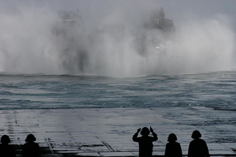 A landing craft air cushioned pulls into the well deck of USS Nassau during the 24th MEU's Composite Unit Training Exercise. This exercise is the MEU's last training exercise before testing for Special Operations Capable status.