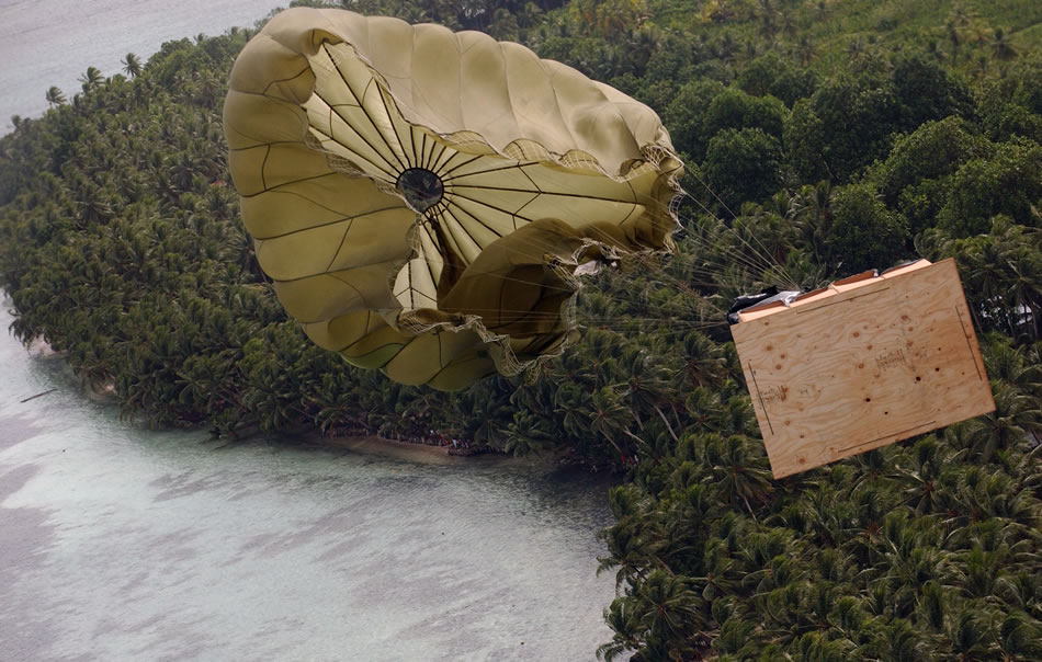 A pallet containing toys, holiday decorations and other donated items floats toward an island of the Western Pacific and Micronesia area, bringing holiday cheer Dec. 14 during Operation Christmas Drop. While Santa Claus must find a rooftop to land his reindeer on, America's Airmen and their four-propeller C-130 Hercules deliver the holiday items from the air and move on to their next target. (U.S. Air Force photo/Senior Airman Brian Kimball)