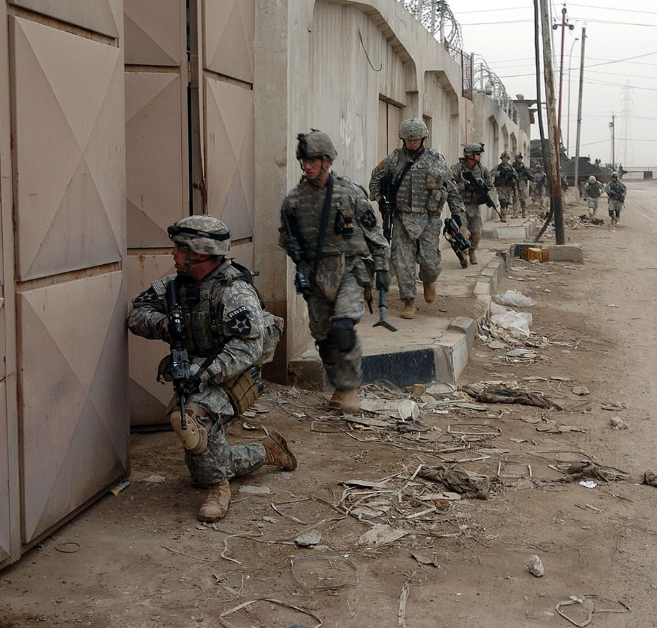 Soldiers with the 5th Battalion, 20th Infantry Regiment, 3rd Stryker Brigade Combat Team, 2nd Infantry Division move down a street and into a compound that contains a factory and several warehouses, Feb. 6, in the Adhamiyah district of Baghdad, Iraq. The Soldiers disrupted insurgent activities in the area in preparation of a new Combat Out Post that is being established in the neighborhood. Photo by Sgt. Michael Garrett