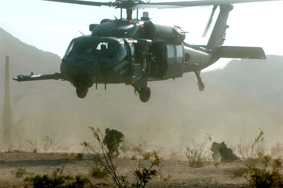 Pararescuemen secure an area after dropping out of an HH-60 Pave Hawk helicopter during Exercise Angel Thunder July 16 at Gila Bend, Ariz. The Airmen are from Davis-Monthan Air Force Base, Ariz. (U.S. Air Force photo/Staff Sgt. Lanie McNeal)