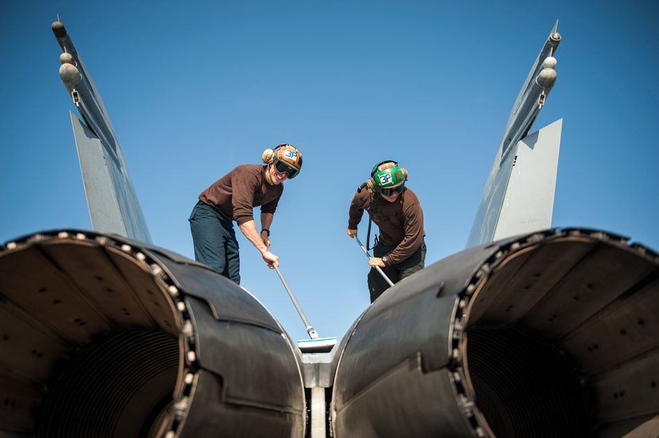 GULF OF OMAN (Oct. 06, 2013) Aviation Machinist's Mate 3rd Class Brandon Shreve, left, and Aviation Machinist's Mate 3rd Class Brendon Holman, assigned to the Ragin' Bulls of Strike Fighter Squadron (VFA) 37, clean an F/A-18C Hornet on flight deck of the aircraft carrier USS Harry S. Truman (CVN 75). Harry S. Truman, flagship for the Harry S. Truman Carrier Strike Group, is deployed to the U.S. 5th Fleet area of responsibility conducting maritime security operations, supporting theater security cooperation efforts and supporting Operation Enduring Freedom. (U.S. Navy photo by Mass Communication Specialist Seaman Apprentice Jacob S. Richardson)