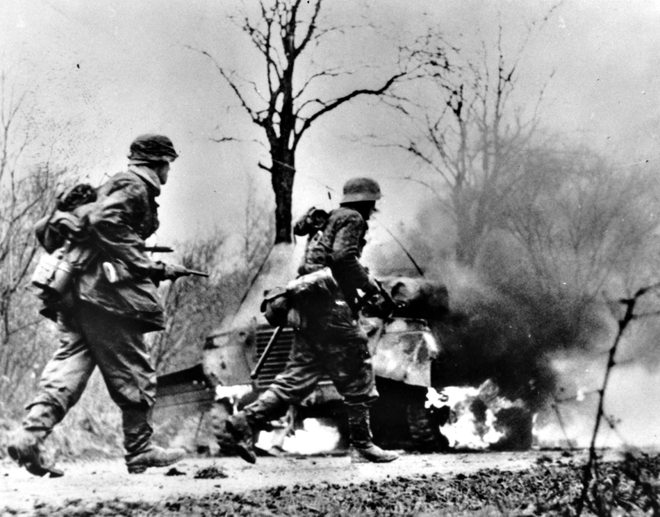 Photograph taken from Captured German Film of German Troops Advancing Past Burning American Equipment during the Battle of the Bulge.