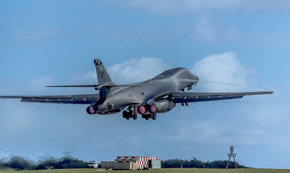 A B-1B Lancer, assigned to the 9th Expeditionary Bomb Squadron and deployed from Dyess Air Force Base, Texas, takes off March 10, 2017, at Andersen AFB, Guam. The B-1B's are deployed to Andersen AFB as part of U.S. Pacific Command's continuous bomber presence operations. This forward deployed presence demonstrates continuing U.S. commitment to stability and security in the Indo-Asia-Pacific region. Most importantly, the bomber rotations provide Pacific Air Forces and PACOM commanders an extended deterrence capability. (U.S. Air Force photo/Airman 1st Class Jacob Skovo)