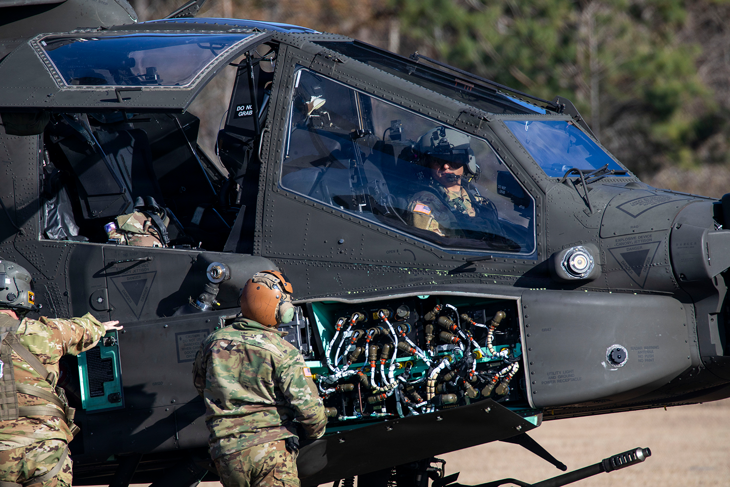 An AH-64 Apache helicopter, assigned to 3rd Squadron, 17th Cavalry Regiment, 3rd Combat Aviation Brigade, is serviced by the ground crew at the Forward Arming and Refueling Point (FARP) during an aerial gunnery exercise at Townsend Bombing Range, Georgia, January 29, 2025. (U.S. Army photo by Staff Sgt. Dean Johnson) Read less
